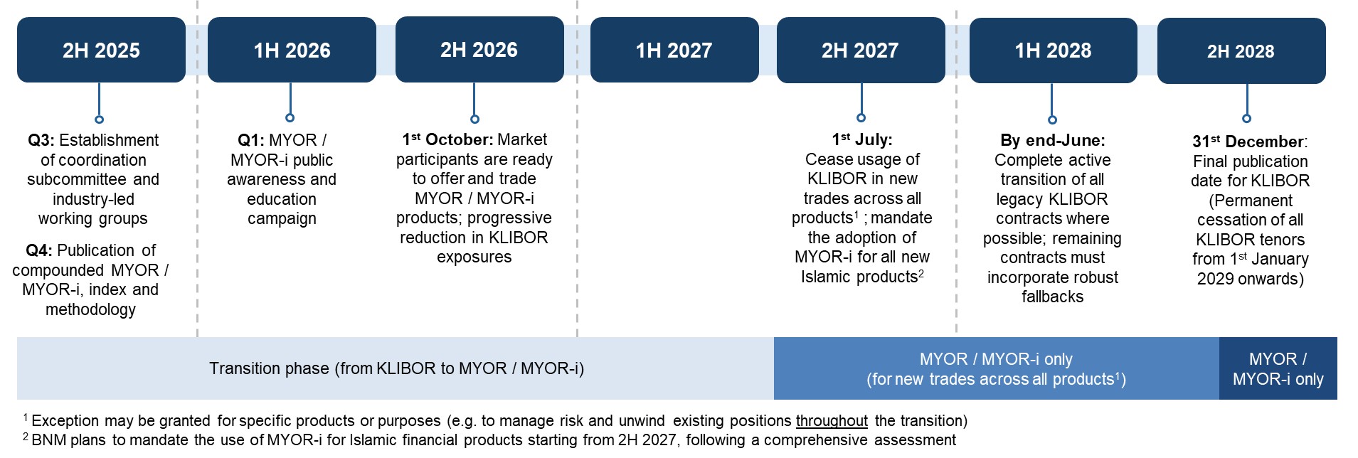 The transition roadmap sets out key timelines and milestones to accelerate the financial industry’s adoption of MYOR and MYOR-i, while supporting market readiness. By end of the transition, KLIBOR will cease to exist after 31 December 2028.